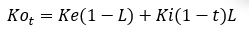 Donde Ke es el costo del capital propio[3]. L es el nivel de endeudamiento que resulta de relacionar la deuda con costo explícito con el ANO. Ki es la tasa de interés, pero como el gasto por interés es descontable de la base gravable de la compañía, el costo de la deuda después de impuestos queda expresado como Ki (1–t), donde la t es la tasa de impuestos de la empresa. Stewart (2000, p. 163) plantea otra forma de calcular el EVA: