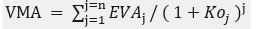 Con el valor de mercado agregado VMA se puede determinar el valor económico agregado de largo plazo, y se calcula al traer a valor presente el EVA de varios periodos, como se muestra en (8):